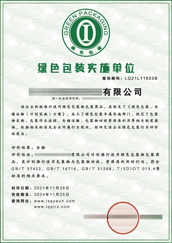 绿色包装实施单位证书